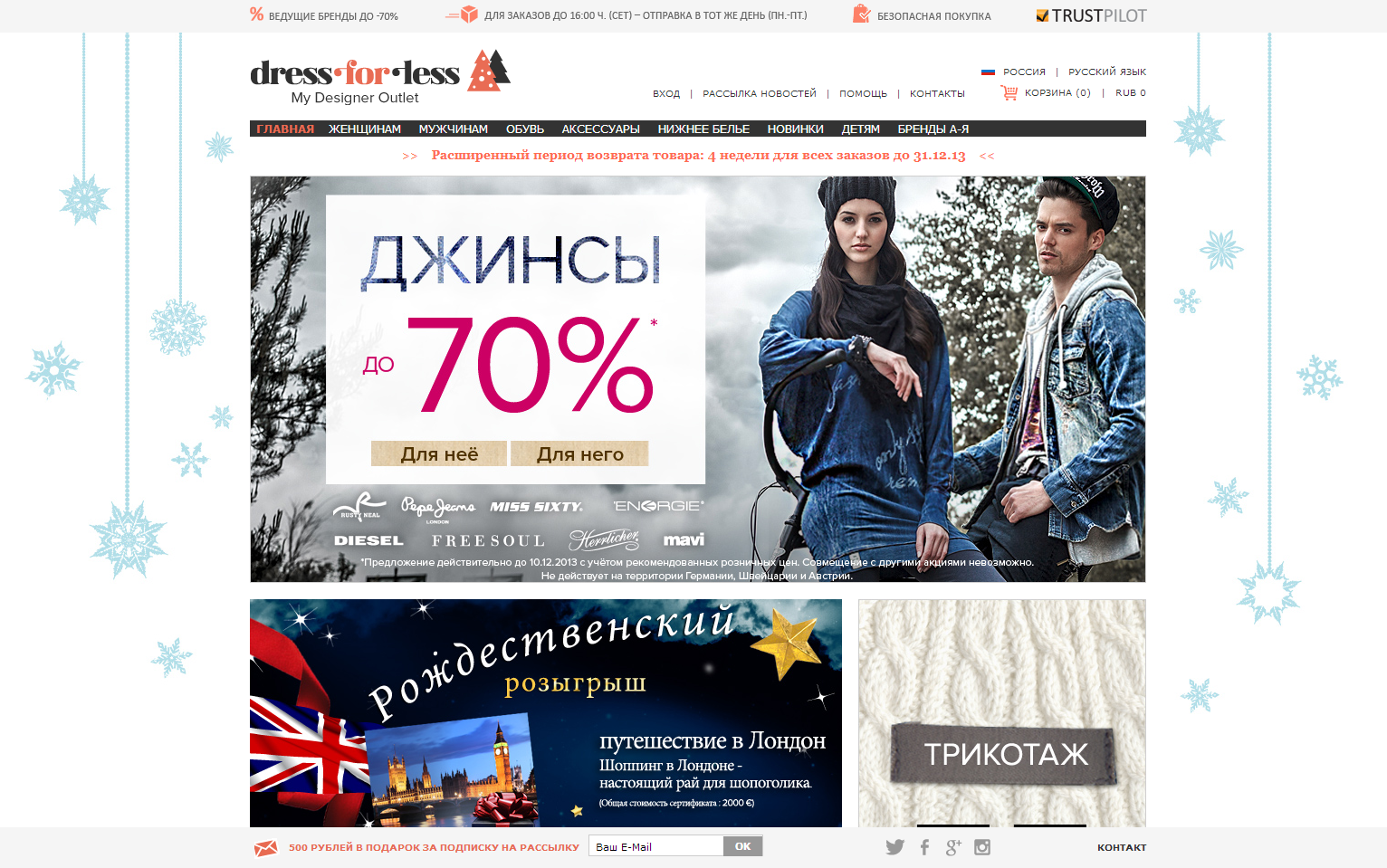 Сайт Dress-for-less, в соответствии с названием, помогает купить вещи дешевле — магазин скупает остатки вещей из коллекций на складах разных брендов, и продает их по сниженным ценам. На сайте достаточно много бредов, распределенных по алфавиту, есть такие известные марки, как DIESEL, Calvin Klein, Anna Klein, Armani, Marco Polo, Replay, O’Neill и другие. Сейчас там скидки до 70% на женские и мужские джинсы, а за подписку на рассылку можно получить 500 руб.